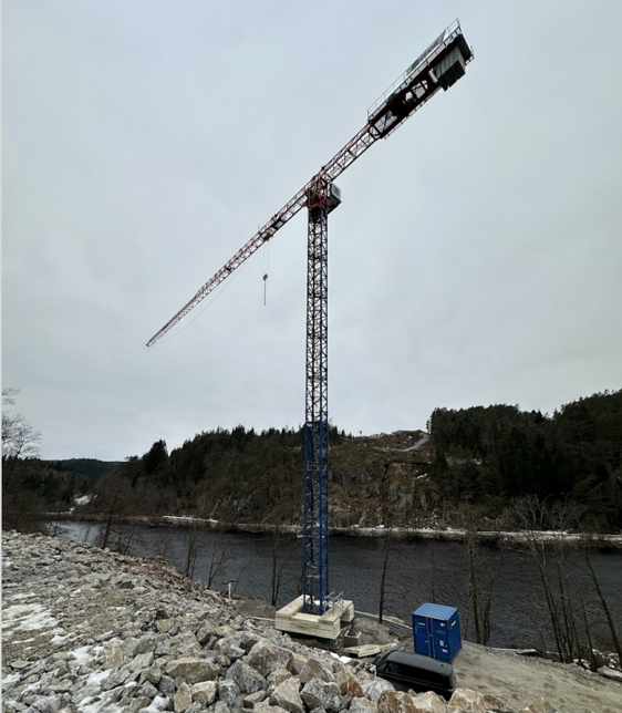 Tårnkrana som er reist ved foten av Mandalselva er blitt et landemerke i Holum nord for Mandal, og kanskje kommunens luftigste arbeidsplass? FOTO: Hæhre Entreprenør