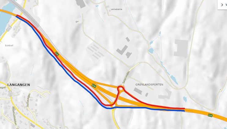 Sørgående E18-trafikk skal tas av på sørgående avkjøringsrampe, opp i trafikkmaskinen, videre over mot Langangen og tas ned på E18 via fremtidig fylkesvei inn mot Langangenbrua.