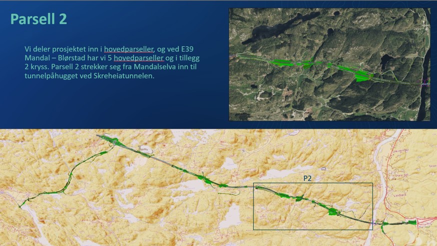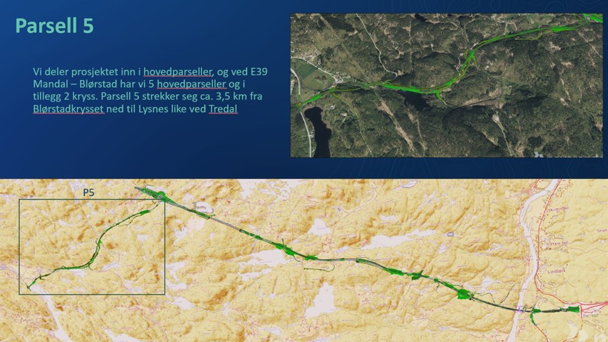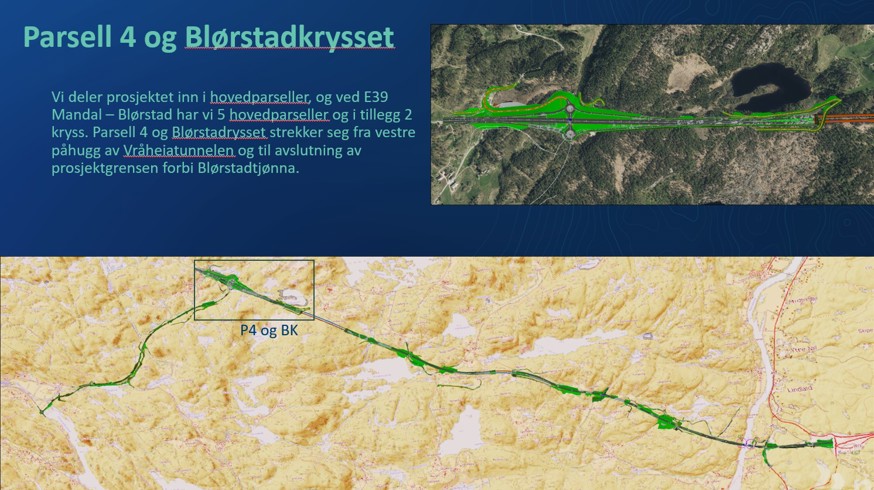 Nye Veier har engasjert Hæhre Entreprenør til å bygge 9,7 km ny, trafikksikker E39 videre fra Mandalskrysset til Blørstad. Derfra skal det også bygges 3,6 km tofelts tilførselsvei til Tredal, hvor man kobler sammen eksisterende E39 med den nye veien i en rundkjøring.