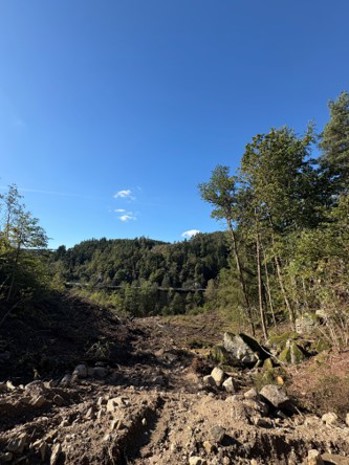 Hogsten er ferdig helt ned til Mandalselva, som ligger midt i bildet her. På andre siden av elva er det også hogd på toppen, der skal veien fortsette på vestsiden av Mandalselva bro. Fremover vil fokuset her bli å lage anleggsvei ned mot elva.