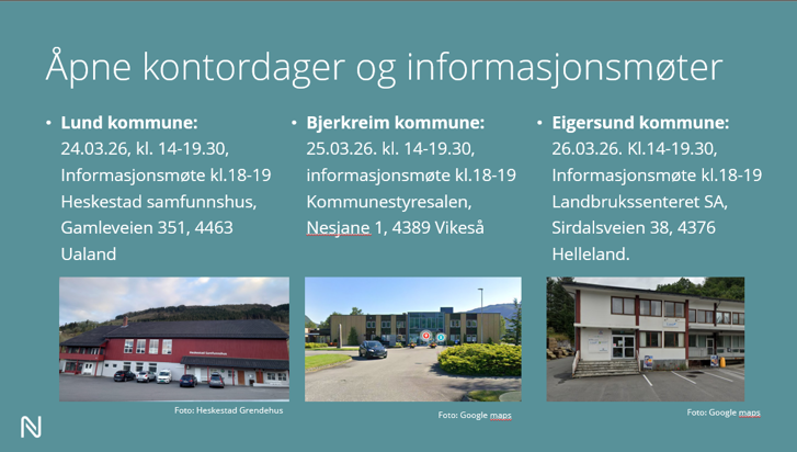 Åpen kontordag og informasjonsmøter blir arrangert i kommunene Lund, Eigersund og Bjerkreim. Her kan alle som ønsker å komme innom få mulighet til å stille spørsmål om prosjektet. Til stede er representanter fra Nye Veier og Sweco.