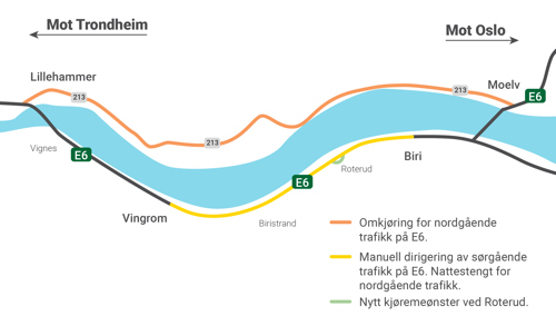 • Nordgående trafikk på E6 mellom Moelv og Lillehammer vil i arbeidsperioden ledes midlertidig via fv. 213 fra Moelv, over Brøttum og videre til Lillehammer.