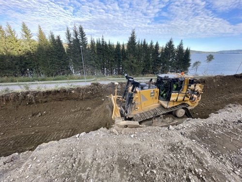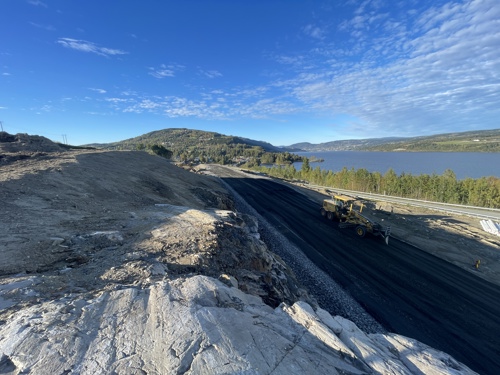 I Øyresvika fortsetter utlasting av løsmasser i forskjæringen til tunnelen. Dette er en omfattende jobb som må gjennomføres både sikkert og effektivt. Hele skjæringen erosjonssikres, kles med jordmasser og tilsås fortløpende mens man graver ut massene. På riggområdet er vi også godt i gang med å etablere vaskehall, verkstedtelt og telt for sprøyteriggen som skal stå klart når tunneldriften kommer i gang ut på vinteren.