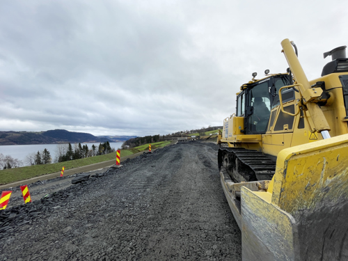 Samtidig benyttes stein fra utsprengningen av Vingnestunnelen på Trosset i grunnarbeidet for det nye nordgående løpet på E6. Masseforflytningen av tunnelstein er den største arbeidsoperasjonen som skal utføres i dette området, og fremdriften styres av både tilgangen på stein og nok klargjorte områder for fylling. Så langt følger arbeidet planlagt fremdrift.